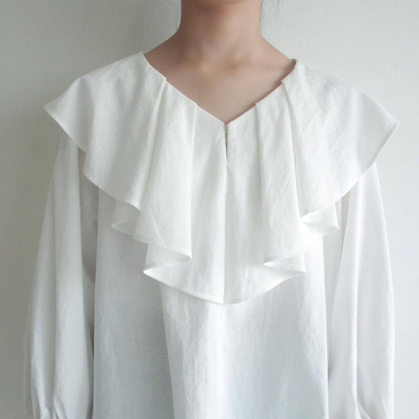 美しいドレープのラッフルカラーがポイントのブラウスです。