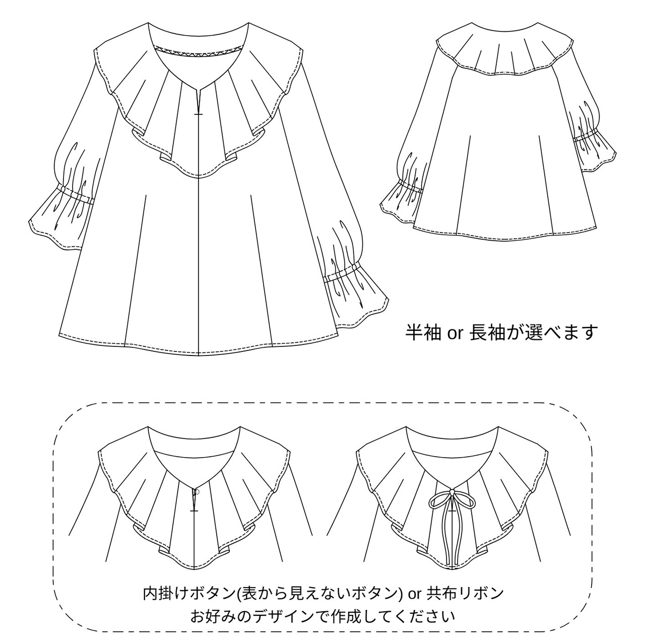 同デザインで、後衿ぐりがゴム仕様になっている【4WAYブラウス】型紙は90~130㎝展開で販売中です。親子でお揃いコーデが楽しめます。