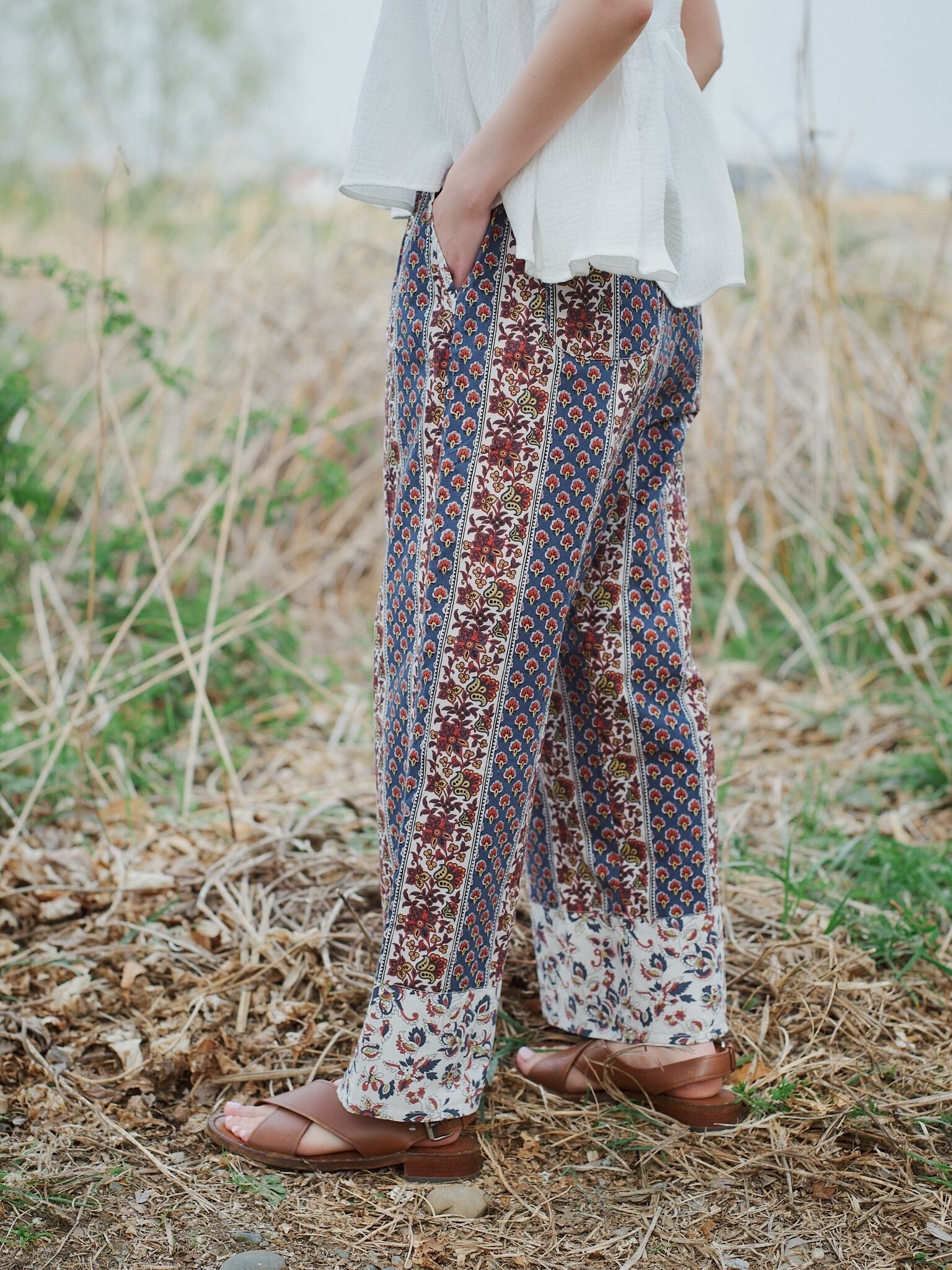 2柄の生地を組み合わせて仕立てた、存在感のあるワイドパンツです。