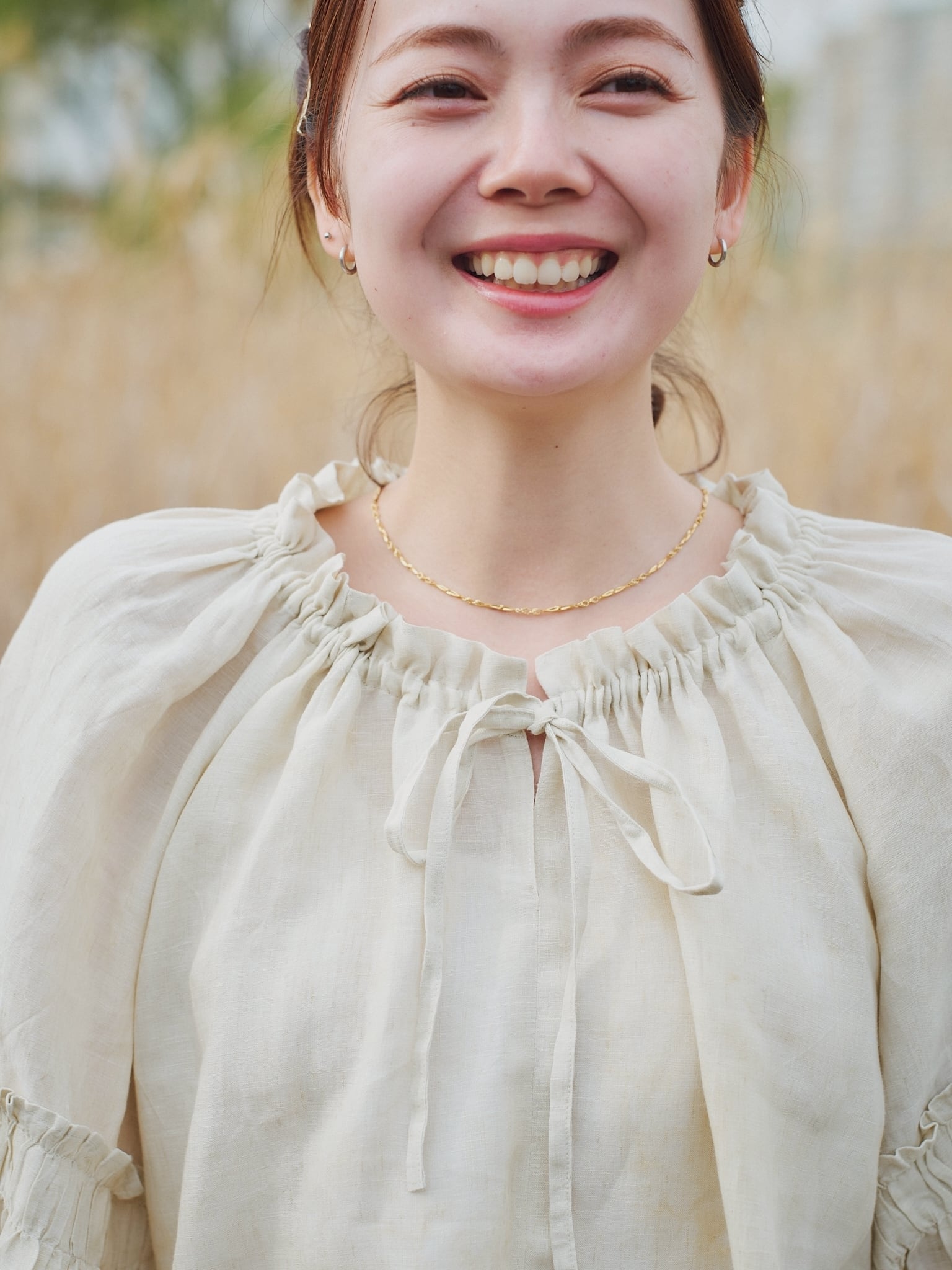 首元にたっぷりギャザーを寄せ、リボンで結ぶデザインにすることで、やさしく女性らしいデザインに仕上げました。